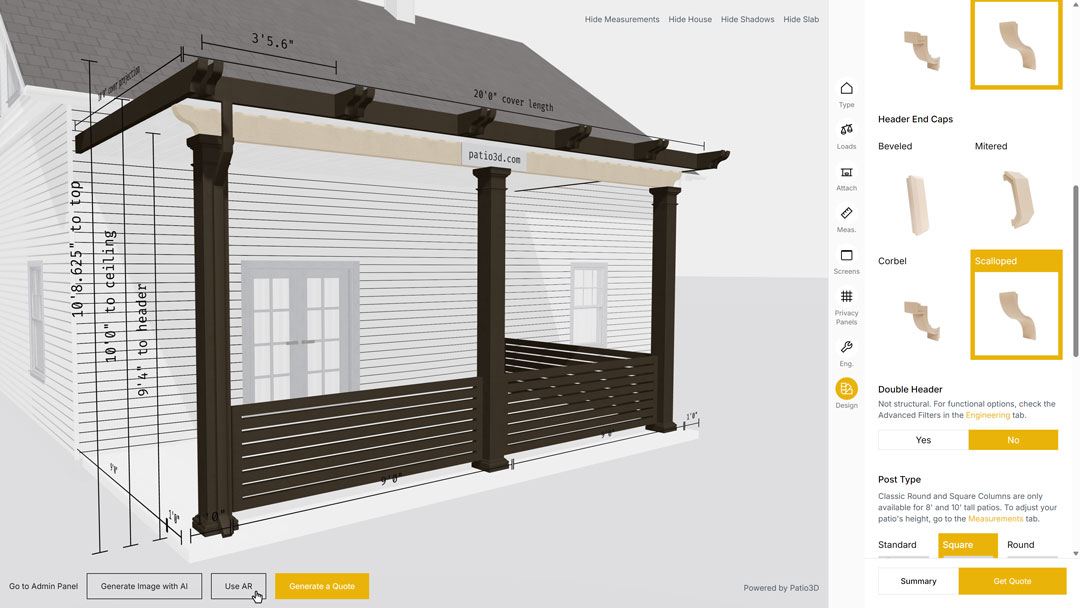 Everything included. Fans, lights, post bases, crowns, bistro tables, and more. Customers see every option placed directly on their patio design.