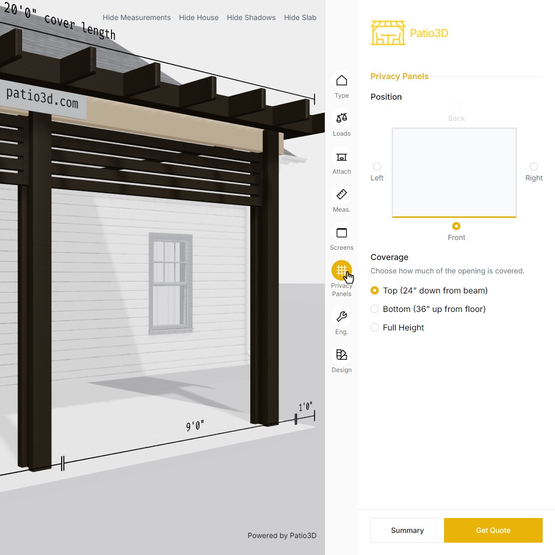 Patio3D defaults to showing the Most Cost-Effective build, but your customers can also switch to Minimum Posts, Minimum Footings, or Maximum Space.