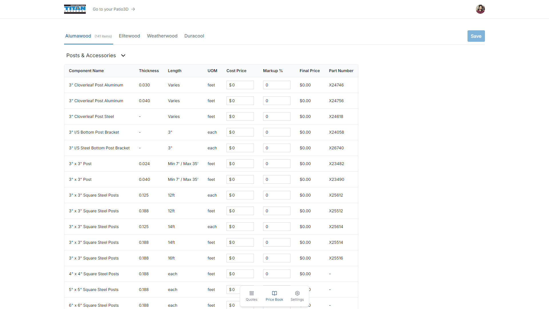 Manage your quote requests, update your pricing book, and customize your Patio3D — in 3 clear pages.